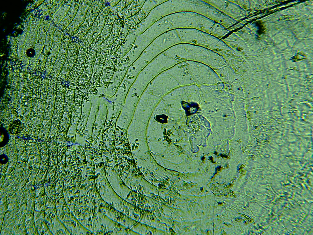 In this image, you can notice the pattern of concentric rings (called annuli), resembling those of tree trunks, of a scale belonging to a Melanotaenia praecox fish.