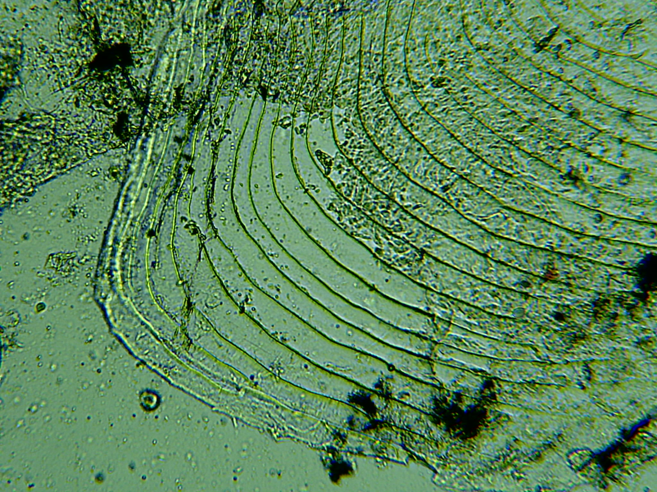 In this image, you can notice the pattern of concentric rings (called annuli), resembling those of tree trunks, of a scale belonging to a Melanotaenia praecox fish.