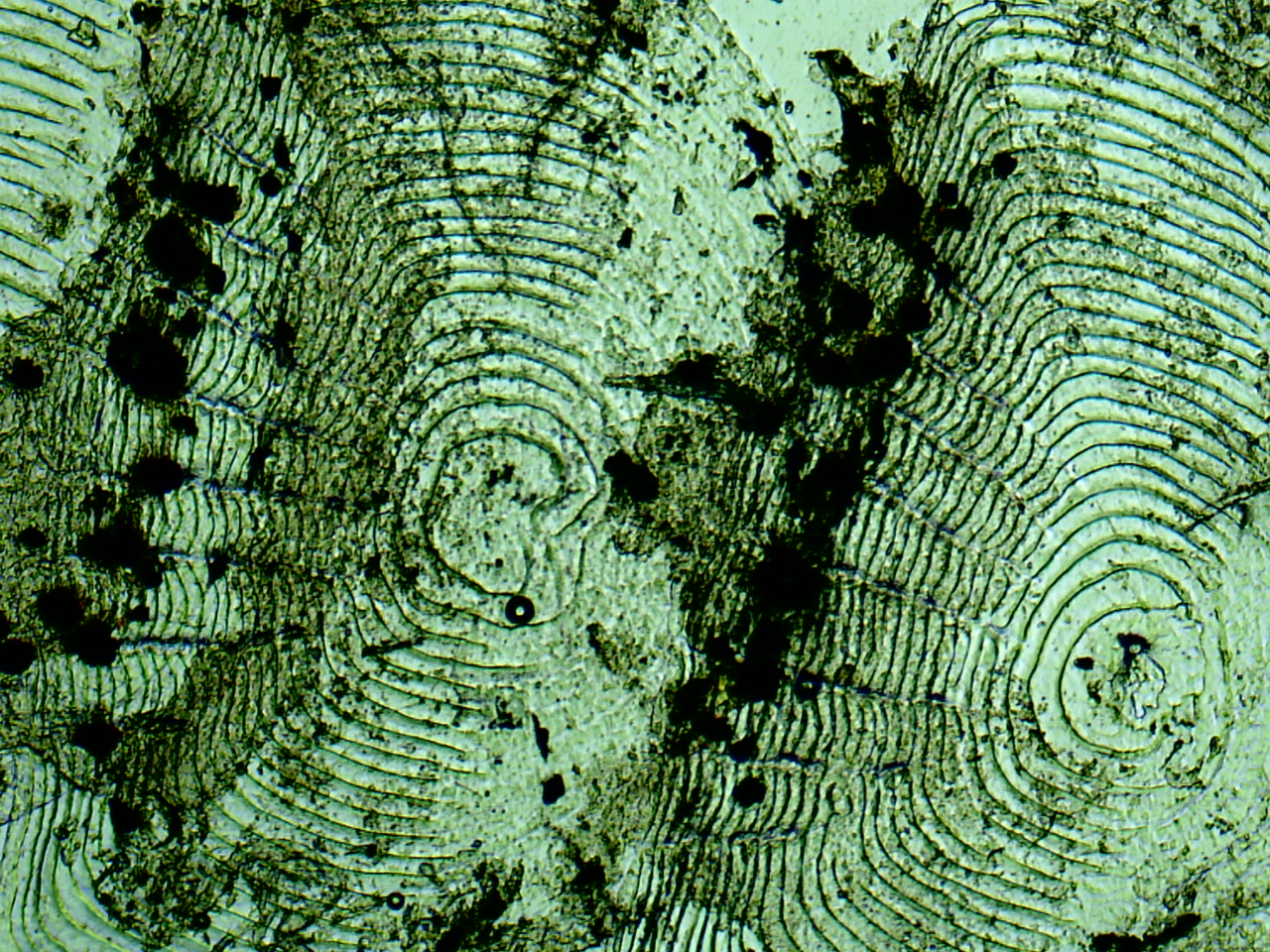 In this image, you can notice the pattern of concentric rings (called annuli), resembling those of tree trunks, of two scales belonging to a Melanotaenia praecox fish.