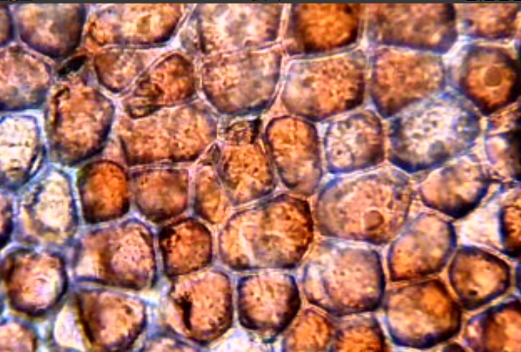 La nivel microscopic, petala de trandafir se înfățișează sub forma unor celule de forme diferite, dar mărimi aproximativ egale, de culoare cărămizie în cazul de față.