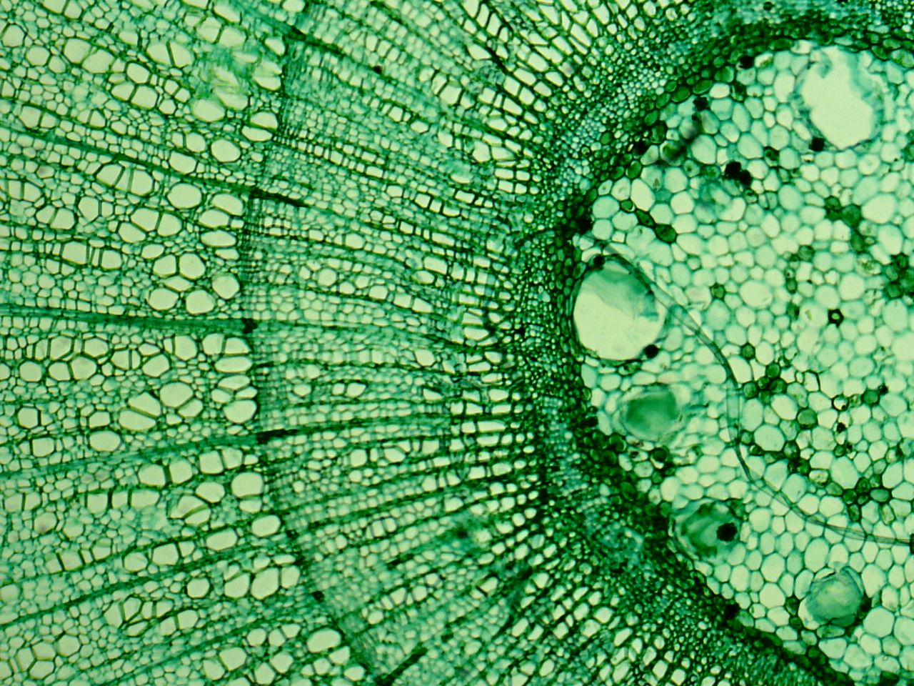 Tulpina unei plante (în cazul de față a unui copac) dezvăluie o frumusețe aparte atunci când este privită la microscop. În dreapta imaginii se observă măduva cu celule de forma unui fagure. Zonele goale din măduvă reprezintă vase conducătoare prin care circulă seva.