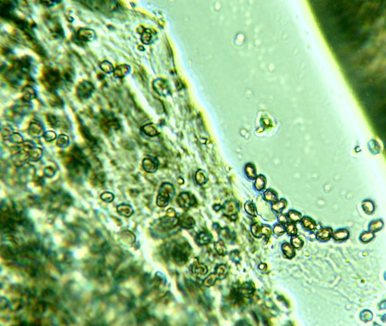 Cu ajutorul unei pensete am desprins de sub pălăria unei ciuperci macromicete (ciupercă care se vede cu ochiul liber) un mic fragment din una din lamelele radiale amplasate dedesubt. Fragmentul l-am așezat pe o lamă și l-am acoperit cu o lamelă. În imagine pot fi observați sporii prin intermediul cărora are loc reproducerea ciupercii.