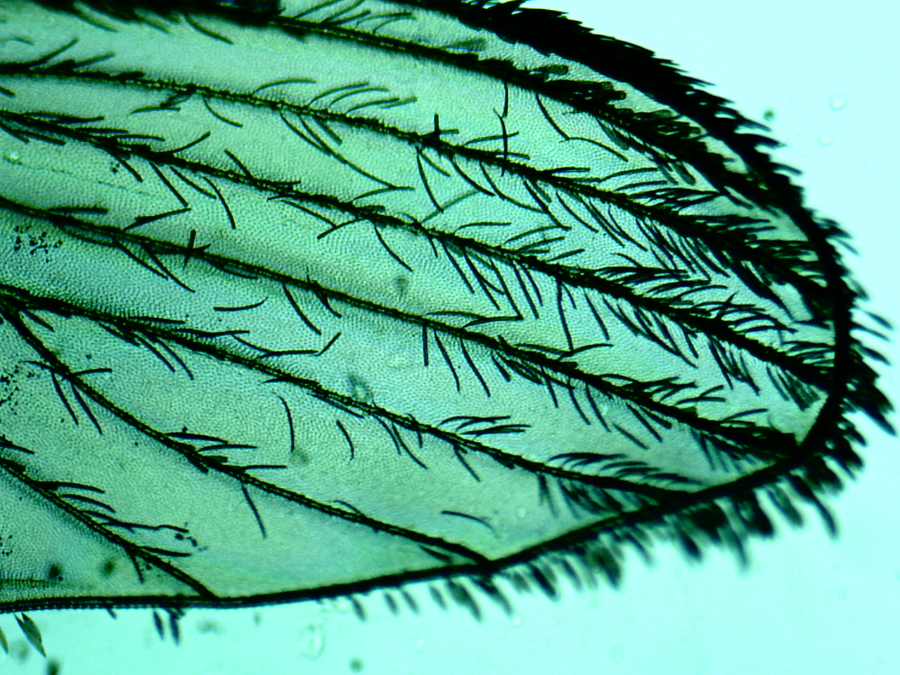 Folosind o pensetă am desprins cu grijă aripa unui țânțar. În imagine se pot observa solzi fini, dispuși atât pe venele aripii, cât și pe marginea acesteia. Solzii contribuie la reducerea frecării cu aerul și la îmbunătățirea zborului. Țânțarii bat din aripi până la 600 de ori pe secundă, producând astfel binecunoscutul zgomot.