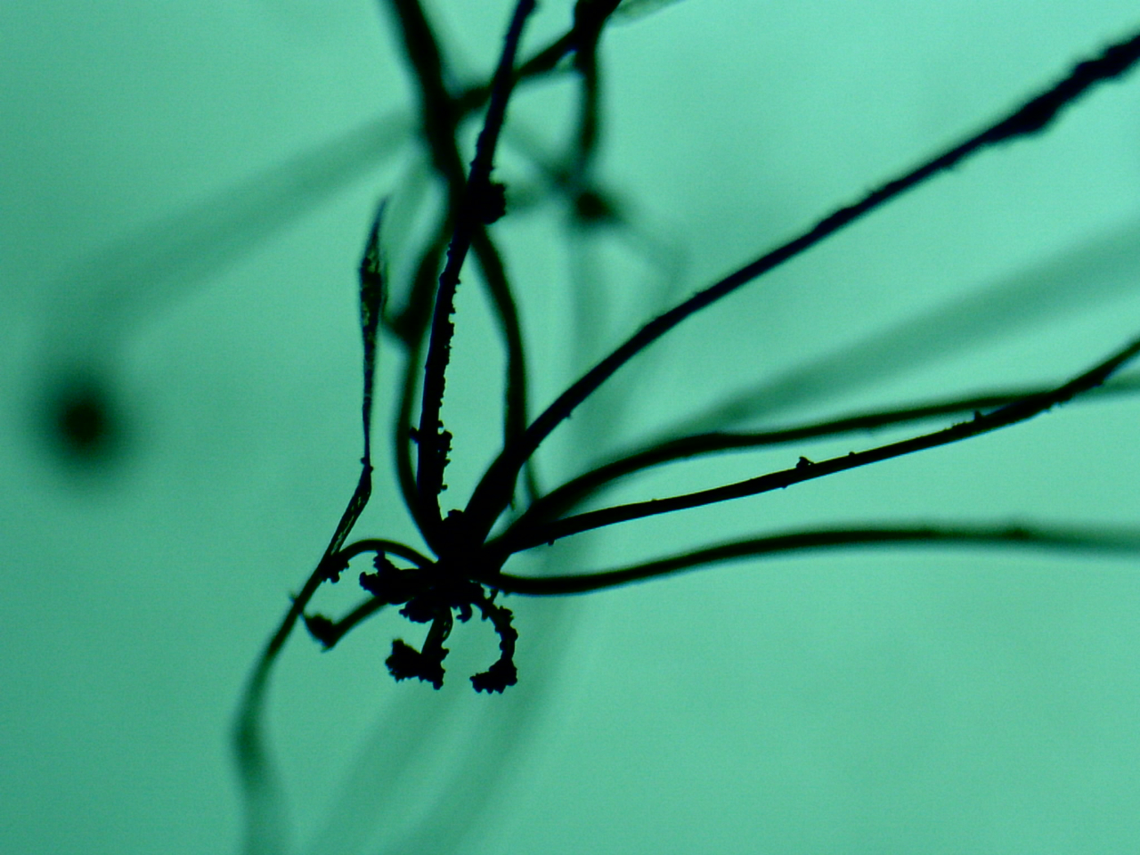 Utilizând o pensetă am desprins un fragment din mucegaiul crescut pe un morcov. În imagine pot fi observați rizoizii produși la baza sporangioforilor mucegaiului. Acești rizoizi prezintă un sistem bine dezvoltat, ramificat, cu ajutorul căruia mucegaiul se fixează în substrat, absorbind elementele nutritive.