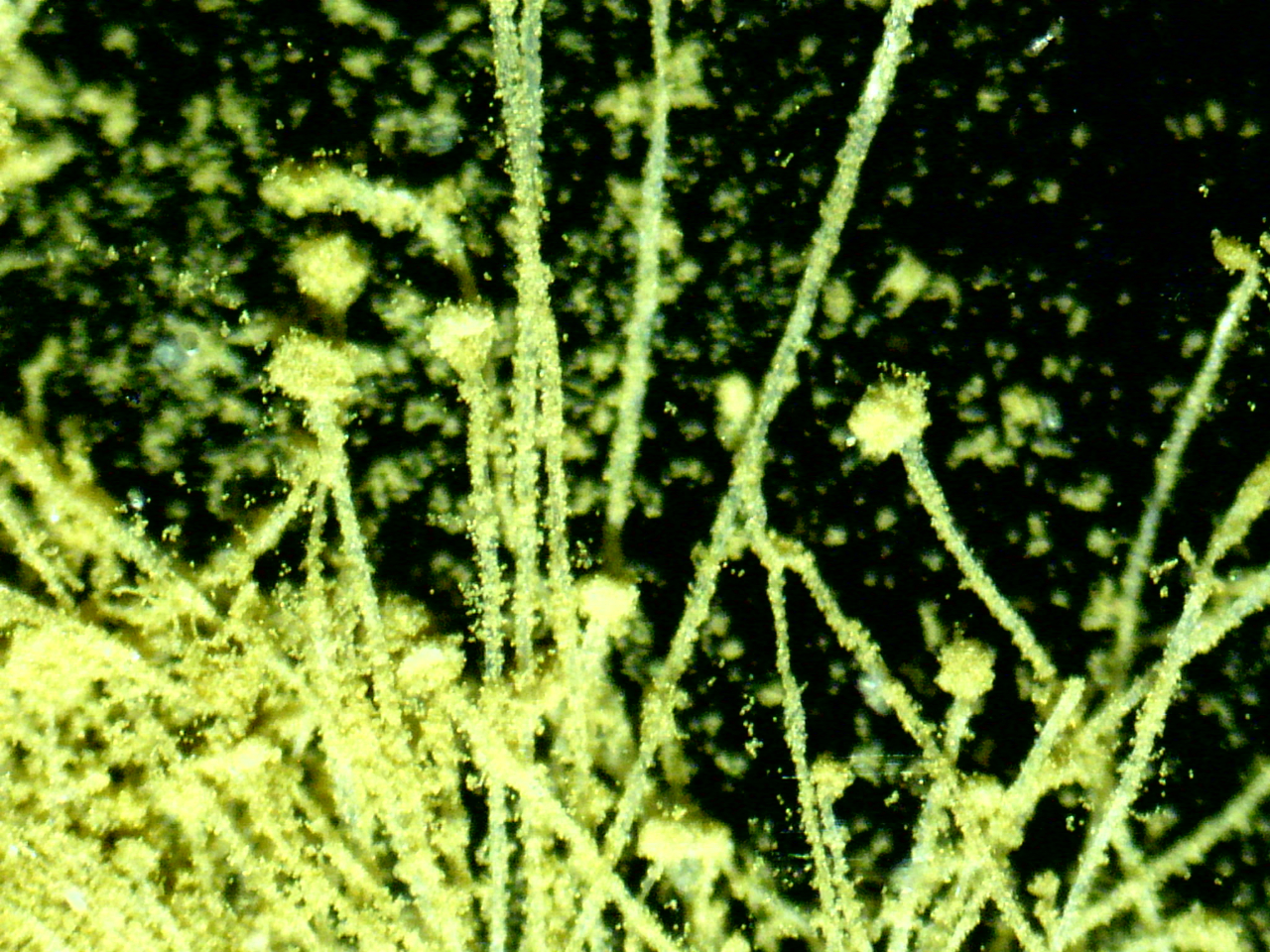 Filamentele multicelulare din imagine aparțin unui mucegai și poartă denumirea de hife. O rețea interconectată de hife formează un miceliu, adică partea vegetativă a mucegaiului. Hifele care poartă sporangi (formele rotunde din imagine) se numesc sporangiofori. Sporangii sunt vizibili și cu ochiul liber, semănând cu acele de gămălie. Ei conțin spori (multitudinea de puncte din imagine) care sunt eliberați în mediul ambiant în momentul în care peretele sporangelui se sparge, astfel având loc reproducerea asexuată a mucegaiului.