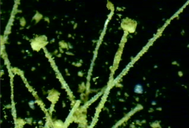 Filamentele multicelulare din video aparțin unui mucegai și poartă denumirea de hife. O rețea interconectată de hife formează un miceliu, adică partea vegetativă a mucegaiului. Hifele care poartă sporangi (formele rotunde din video) se numesc sporangiofori. Sporangii sunt vizibili și cu ochiul liber, semănând cu acele de gămălie. Ei conțin spori care sunt eliberați în mediul ambiant în momentul în care peretele sporangelui se sparge, astfel având loc reproducerea asexuată a mucegaiului.